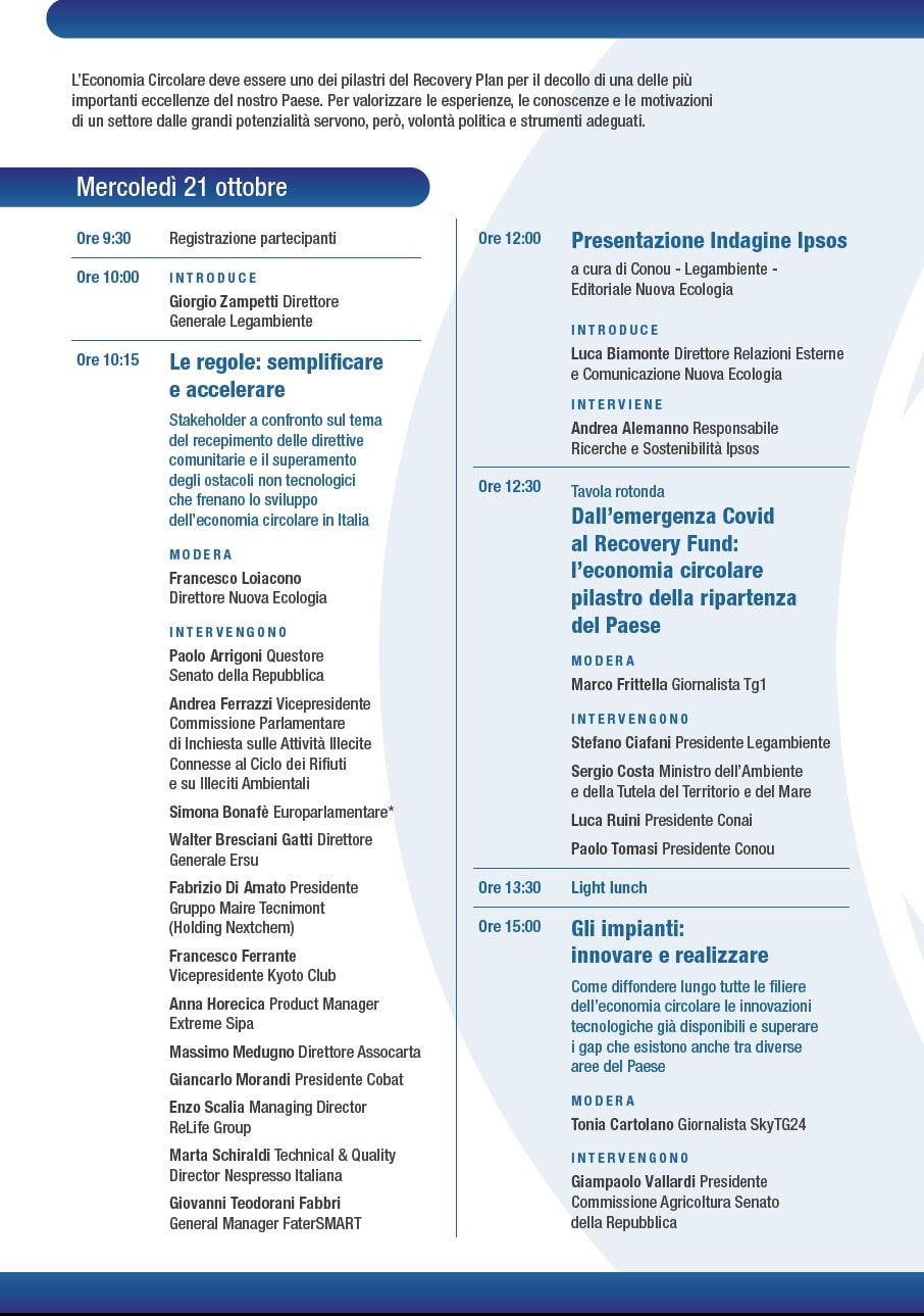 L’evento vedrà confrontarsi esperti del settore, rappresentanti politici e istituzionali, a cominciare dal ministro dell’Ambiente Sergio Costa, aziende innovative e all’avanguardia su un tema caro agli italiani, quello dell’economia circolare e della sostenibilità ambientale. Il talk show inizia mercoledì 21 ottobre in diretta streaming alle 10 con l’introduzione del direttore generale di Legambiente Giorgio Zampetti, a seguire la prima sessione dedicata a Le regole: semplificare e accelerare, moderata da Francesco Loiacono Direttore Nuova Ecologia, che vedrà stakeholders a confronto sul tema del recepimento delle direttive comunitarie e il superamento degli ostacoli non tecnologici che frenano lo sviluppo dell’economia circolare in Italia. Alle 12 viene presentata l’indagine Ipsos, a cura di Conou – Legambiente- Editoriale La Nuova Ecologia, con l’introduzione di Luca Biamonte Direttore Relazioni Esterne e Comunicazione Nuova Ecologia. A seguire, alle 12.30, la tavola rotonda Dall’emergenza Covid al Recovery Fund: l’economia circolare pilastro della ripartenza del Paese, moderata da Marco Frittella giornalista Tg1, in cui interverrà il ministro dell’Ambiente Sergio Costa. Nel pomeriggio, dalle 15, prende il via la sessione dal titolo “Gli impianti: innovare e realizzare”, moderata da Tonia Cartolano Giornalista SkyTg24, in cui si parlerà di come diffondere lungo tutte le filiere dell’economia circolare le innovazioni tecnologiche già disponibili e superare i gap che esistono anche tra diverse aree del Paese.
