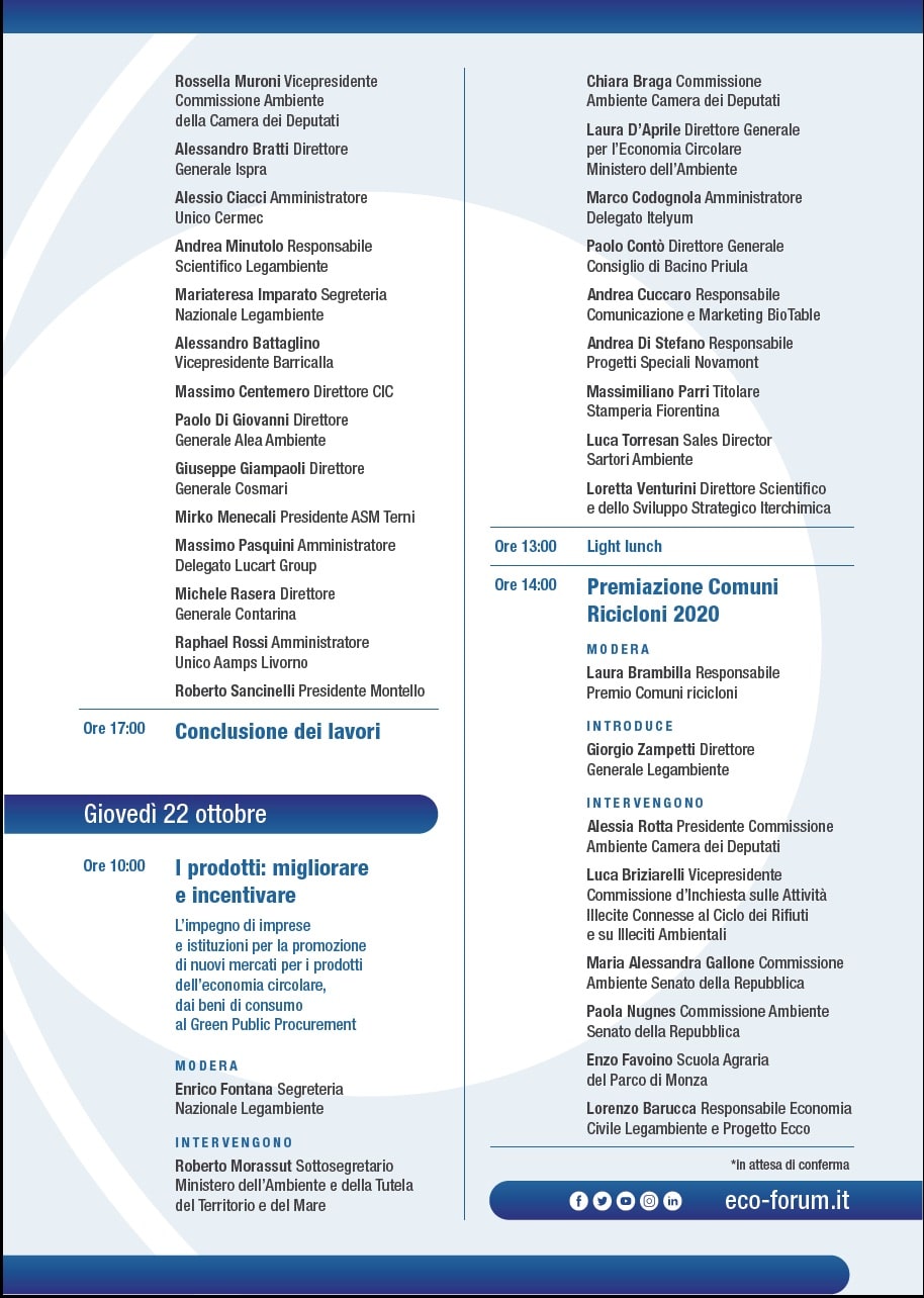 La seconda giornata, giovedì 22 ottobre, inizierà alle ore 10.00, sempre in diretta streaming, con la sessione dal titolo I prodotti: migliorare e incentivare, moderata da Enrico Fontana della Segreteria Nazionale Legambiente. Si parlerà dell’impegno di imprese e istituzioni per la promozione di nuovi mercati per i prodotti dell’economia circolare, dai beni di consumo al Green Public Procurement. Tra gli ospiti che interverranno, anche Roberto Morassut, Sottosegretario Ministero dell’Ambiente e della Tutela del territorio e del mare.